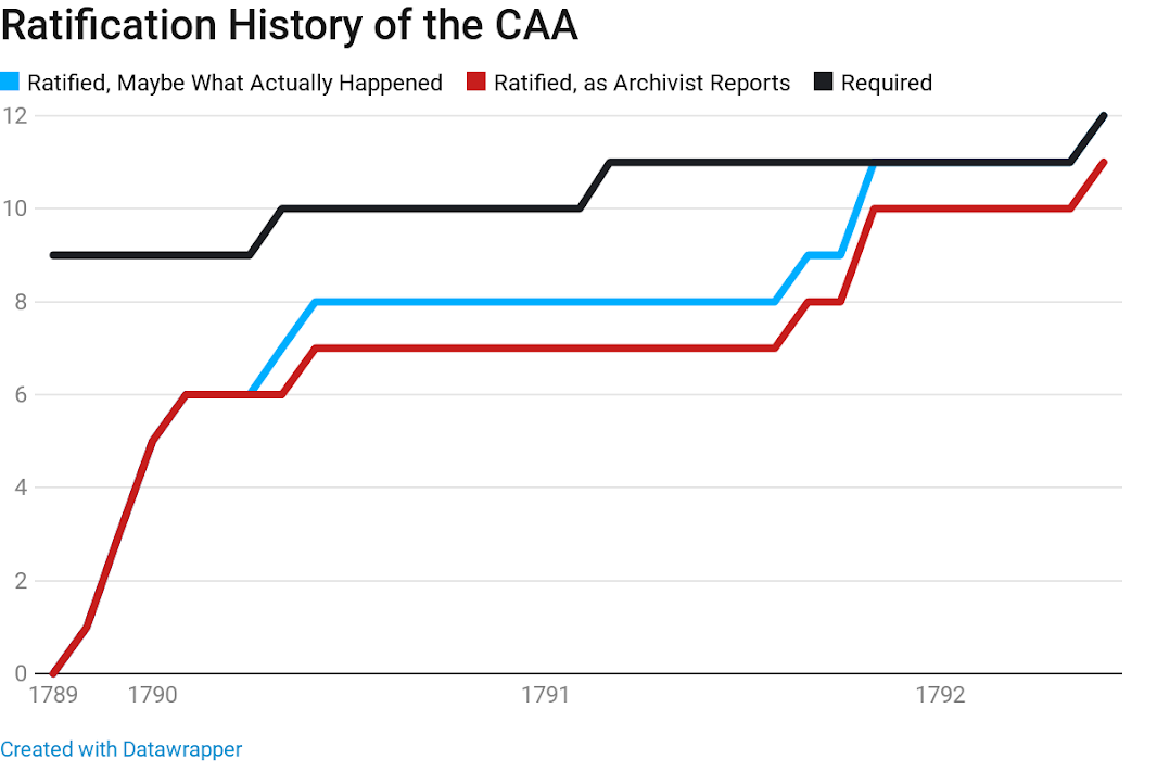 But one of these finicky states was Connecticut. Connecticut ratified the CAA, then tried to un-ratify it, then re-ratified. But alas, the record of these ratifications was lost to history, until rediscovered in 2011. This matters for a very simple reason: if Connecticut really did ratify the CAA, then the CAA got enough ratifications to be certified as an amendment. The graph below shows the timeline of ratification.