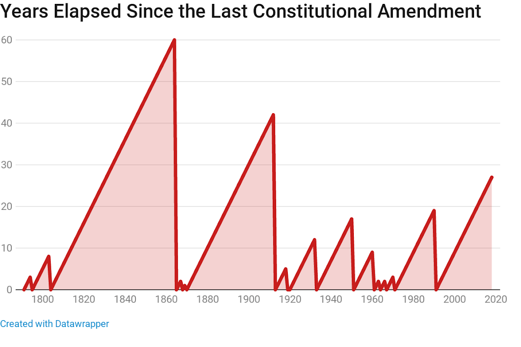 And indeed, it’s high time for reform. The chart below shows how much time had elapsed since the most recent constitutional amendment throughout U.S. history.