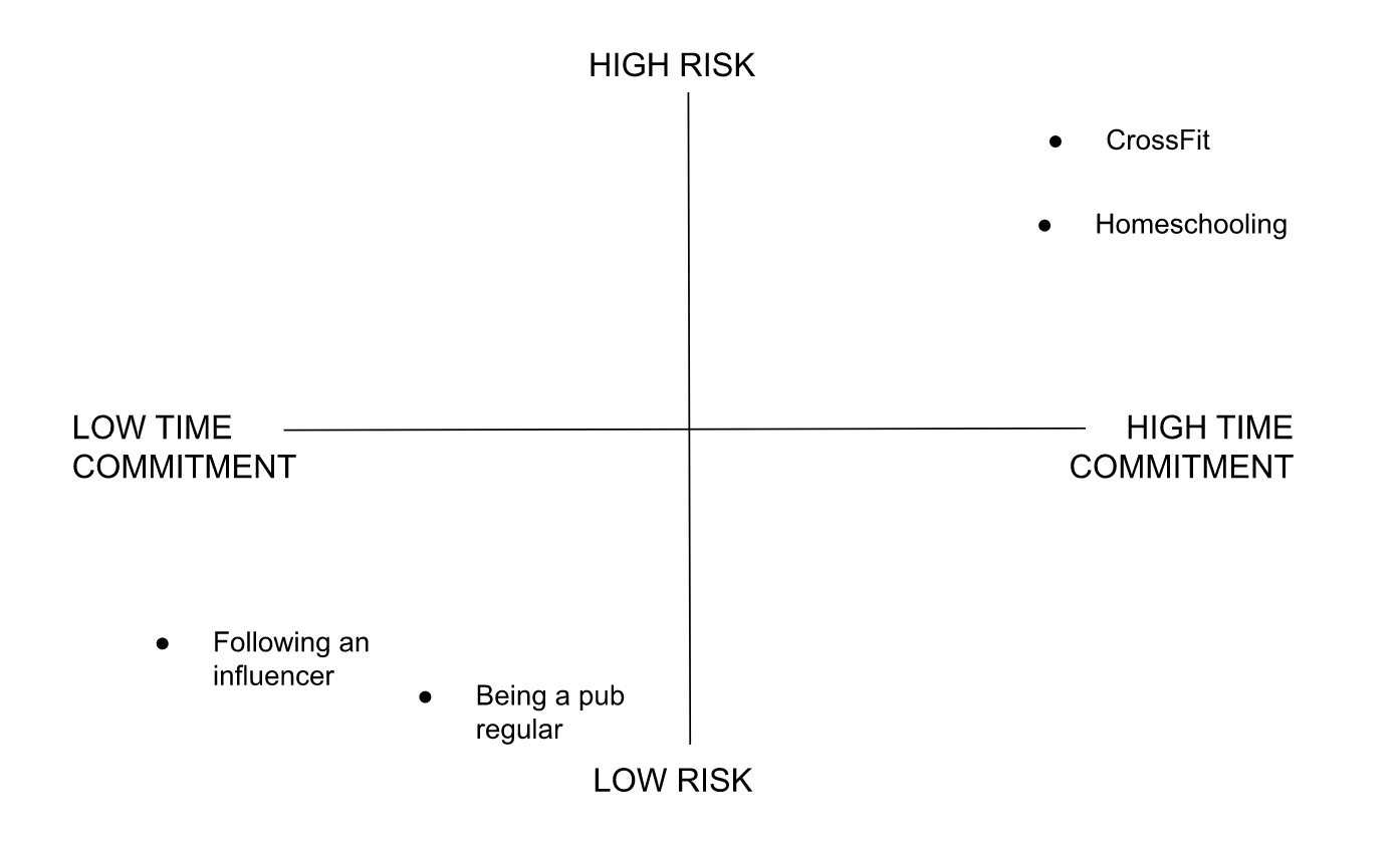 Alternatively, following an influencer or being a pub regular occur in the opposite quadrant, where lower risk and lower time commitment are asked of the patron.