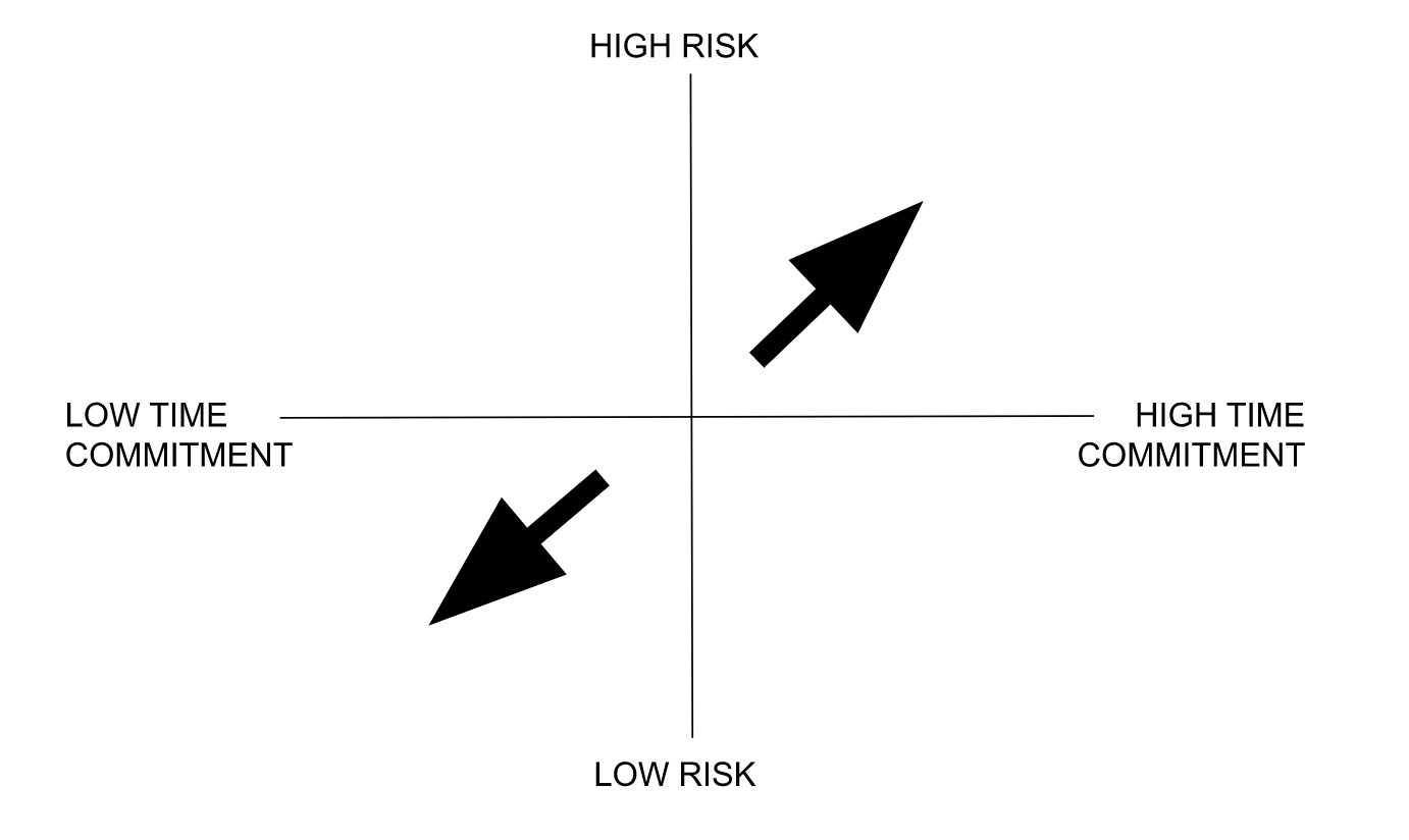 Once we landed on those variables, we decided to track them on a double-axis graph. The horizontal axis tracks time commitment from low to high, and the vertical axis tracks risk from low to high. The first thing we did was plot where successful programs in our culture at-large were. And we immediately gained our first insight.