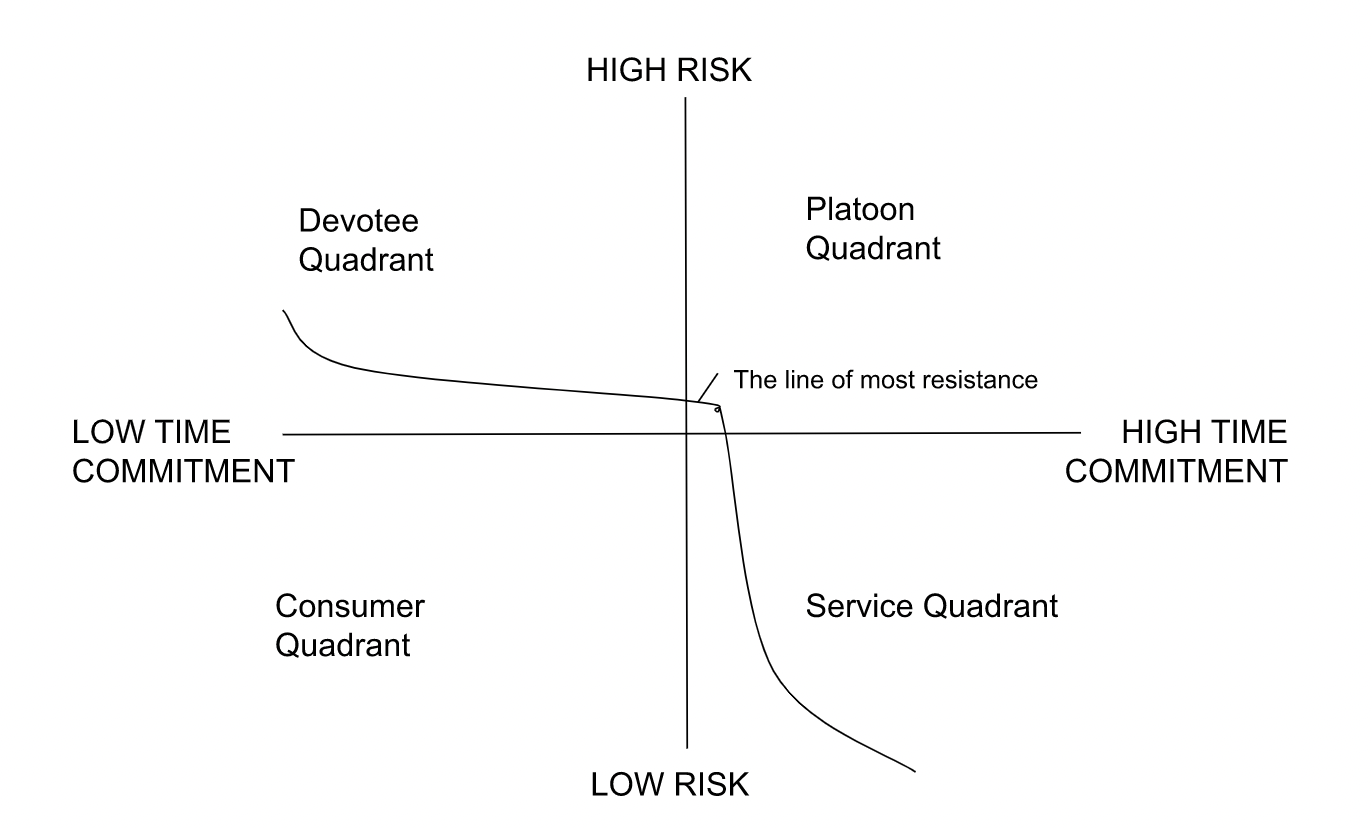 The Platoon Quadrant was inspired by Army usage, signifying that the number of adherents to a particular squad may be small (10 or 11 people), but the fervor and commitment would be high. The Consumer Quadrant was simple enough: there’s not a big ask for time or risk, so one can simply consume what is offered.